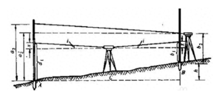 2、將水準(zhǔn)儀放在A點(diǎn)或B點(diǎn)約2米處(C點(diǎn)), 整平,讀出標(biāo)尺讀數(shù)a2, b2;